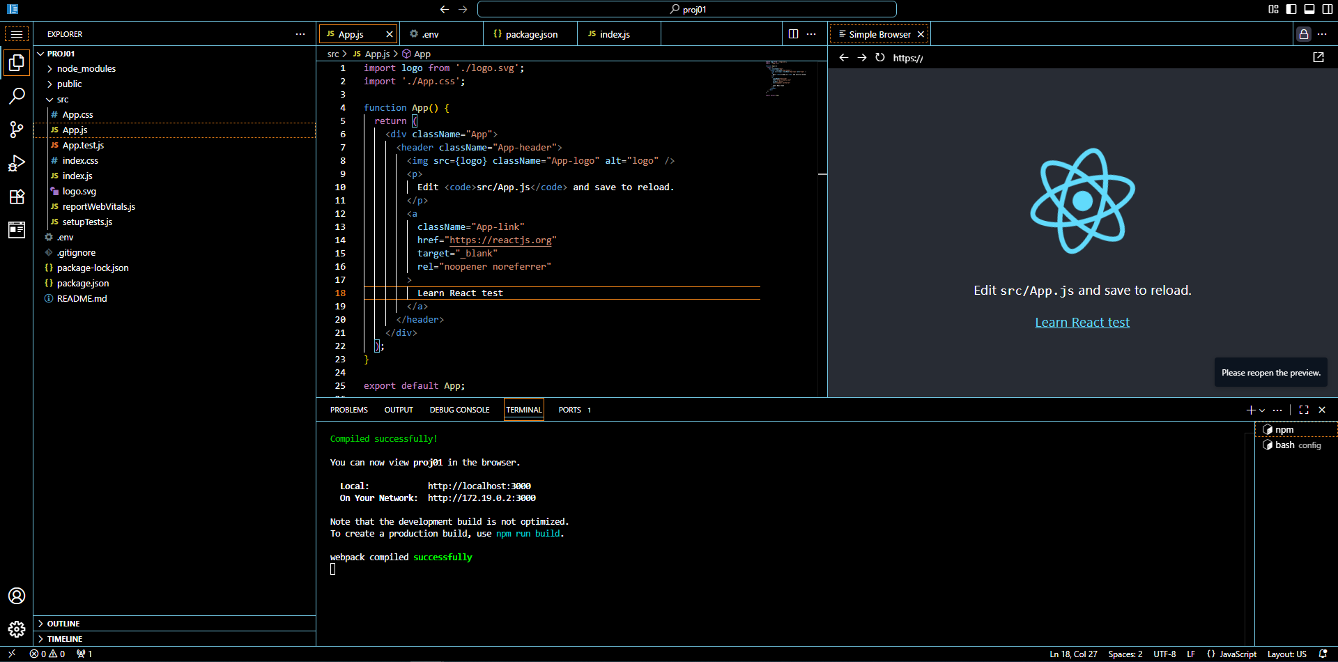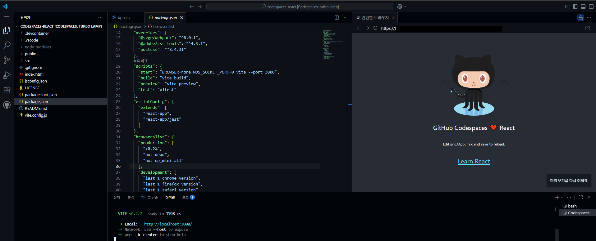 깃허브 codespace에 내부 브라우저에서 React를 수정을 확인할 수 있다.