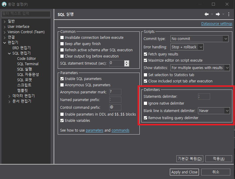 윈도우(W) > 환경설정(P) > 편집기 > SQL 편집기 > SQL 실행
